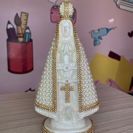 - Acabamento de Luxo: A peça é cuidadosamente adornada com aplicações de Pérolas e fileiras de Strass, conferindo um brilho sutil e uma textura rica que remete à pureza.
