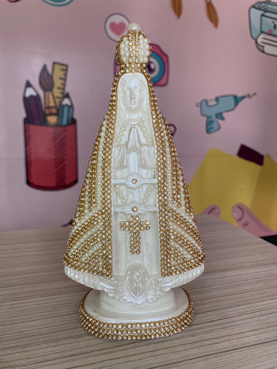 - Rico Acabamento: O manto e a base são integralmente decorados com a aplicação cuidadosa de Pérolas e fileiras de Strass Dourado, conferindo um visual sofisticado e um brilho marcante à imagem.